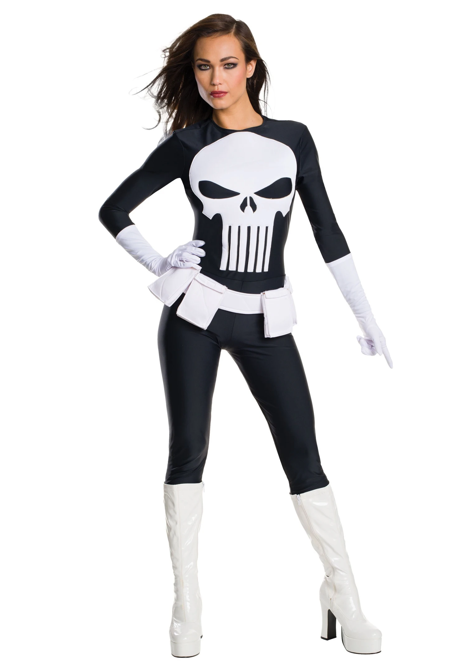 This Womens Punisher Costume brings you the finest in villain vanquishing attire. Based on the Marvel Comics anti-hero, the form-fitting jumpsuit comes with the deadly skull symbol designed right into the front, so you can start your foray into the superhero game with a bang. The belt comes with pouches on it, so you can look ready for a fire fight no matter where you are, whether that’s the crowded streets of New York City, or just at a costume party. Just make sure that you come armed to the teeth, since those baddies (or other costume party goers) won’t go down without a fight!