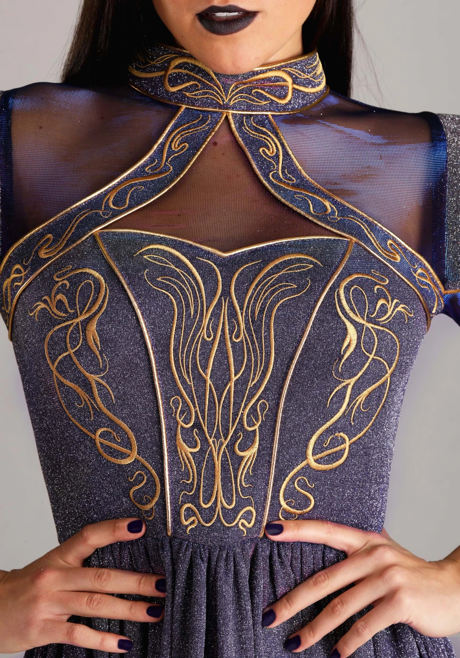 The bodice features a dynamic keyhole neckline, iridescent mesh modesty paneling, and broad flared shoulders—a structured look befitting a warrior wizard. Made from the same shimmering stretch fabrics, it offers a comfortably snug fit when zipped into place.