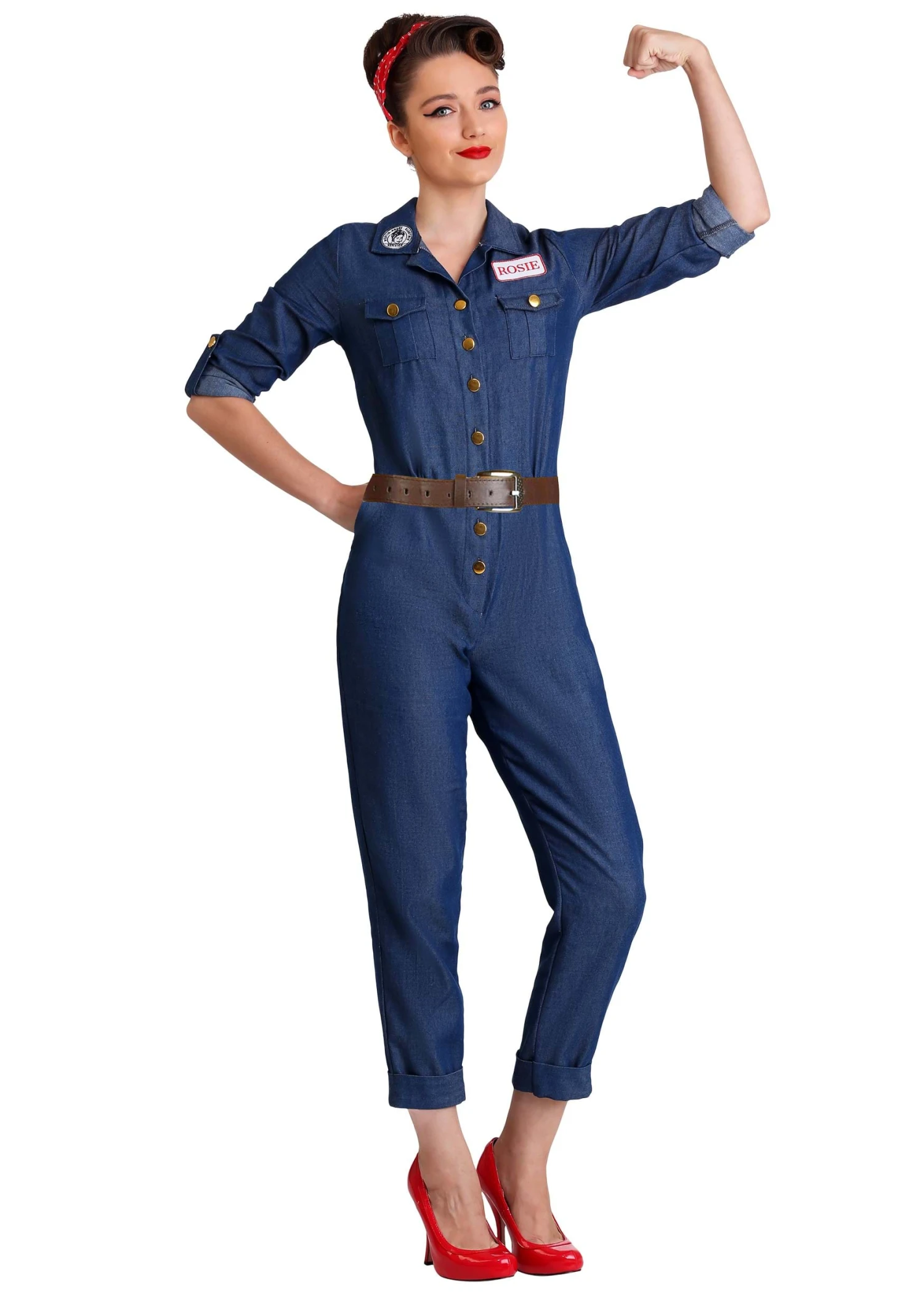 Ready to balance grit with glamour? Our Made by Us World War Two Icon costume is a fashionable interpretation of the inspirational posters that were popular during the height of the war effort. Our in-house designers put together a sleek jumpsuit made of denim fabric that can easily be worn with heels or boots. The jumpsuit values up the front and has functional side pockets at the hips as well as gusseted breast pockets for a fully functional look. The costume is polished off with the faux leather belt and iconic red bandana, leaving you looking riveting right off the bat.