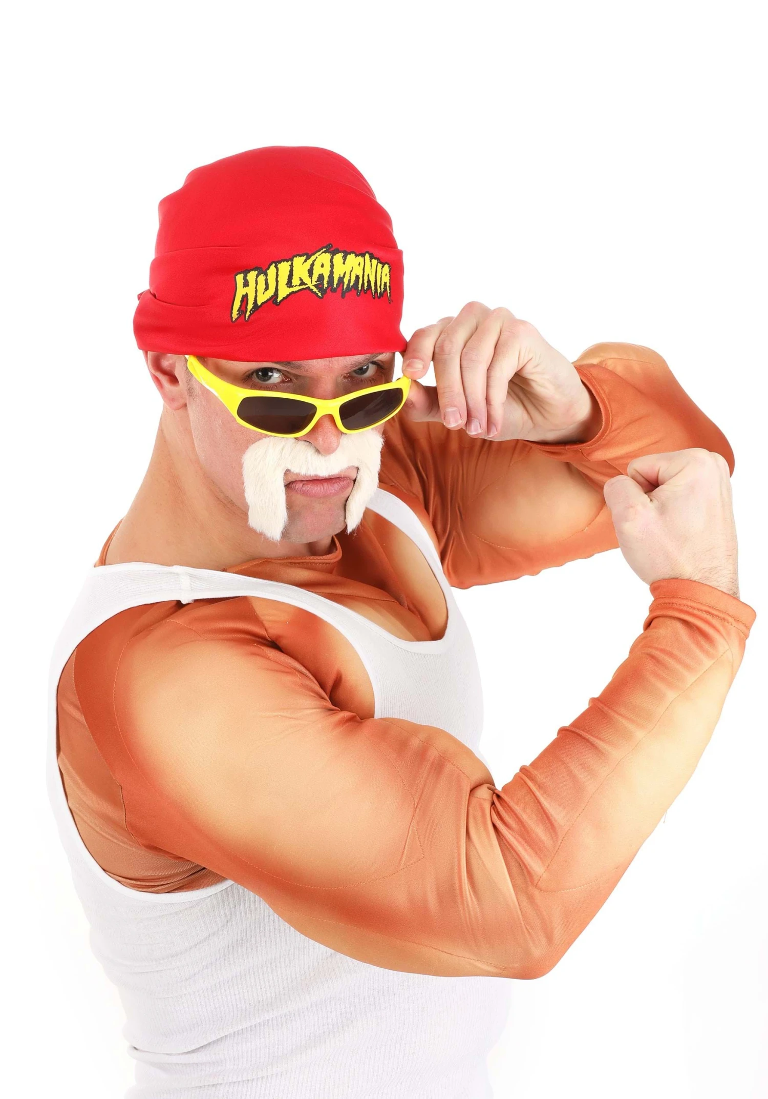 Hulk out in glorious style when you pick up this officially licensed WWE Hulk Hogan Costume Kit! This Made By Us accessory set starts with a jersey headscarf that features the Hulkamania graphic in bright yellow and black over the red background of the bandana. A pair of yellow sunglasses are shaped to look like the wrestler’s own and a self-adhesive mustache made of faux fur is ready to adorn your face! All you’ll need to do is supply the energy!