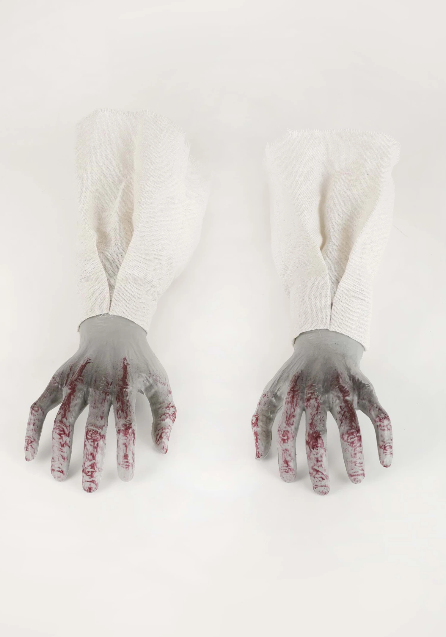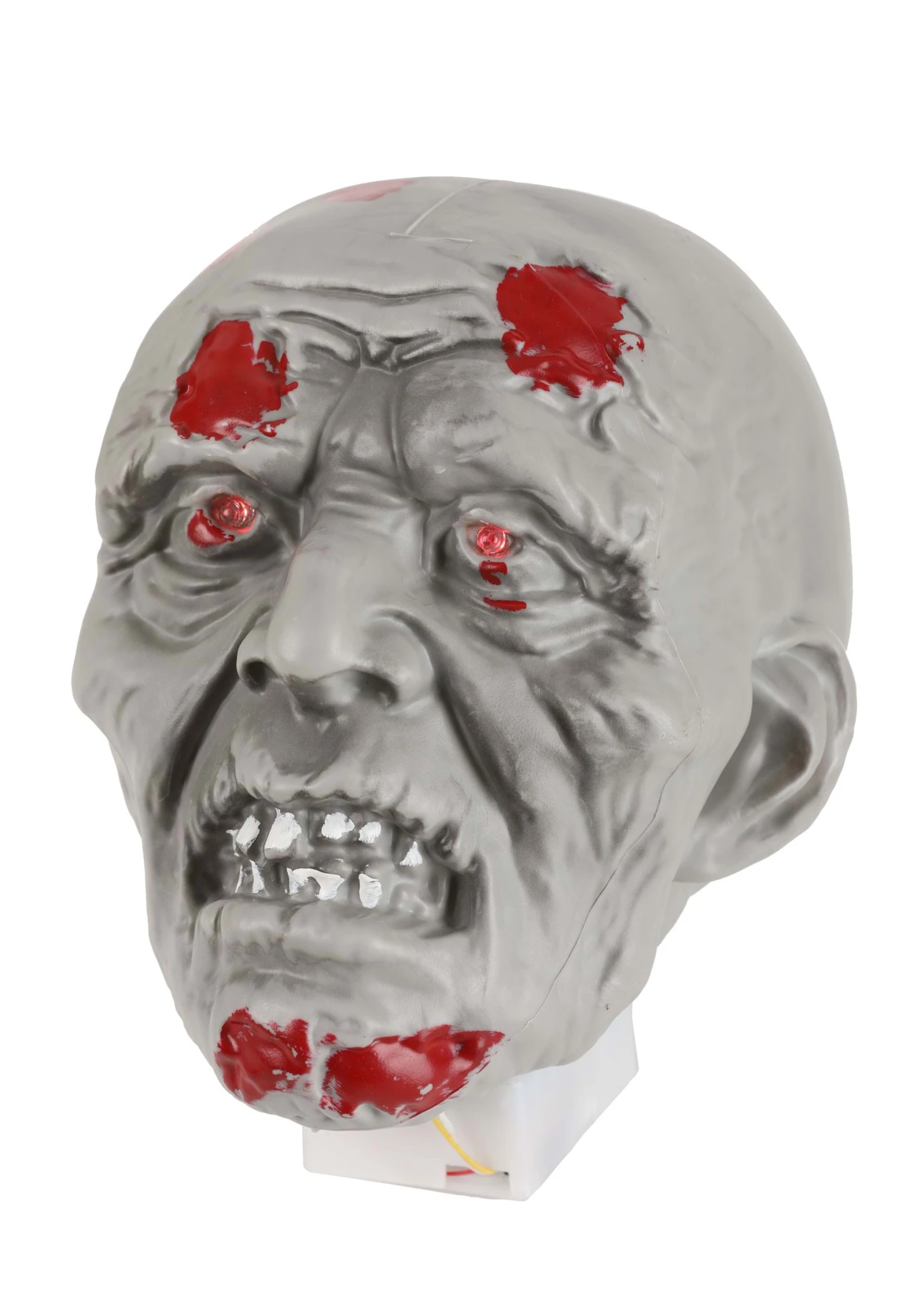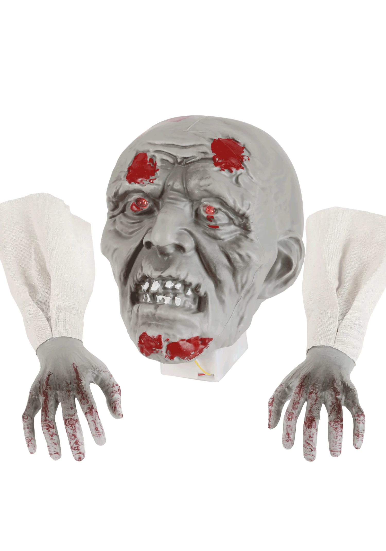 Hungry for Halloween fun? Set out this exclusive Zombie Head and Hands with Lights Halloween Decoration! The set includes a molded gray head with shriveled features and daubs of fake blood. The lightbulbs set into its eye sockets glow red when activated. Its two matching gray hands are splattered with blood droplet details and come encased in fake sleeves.